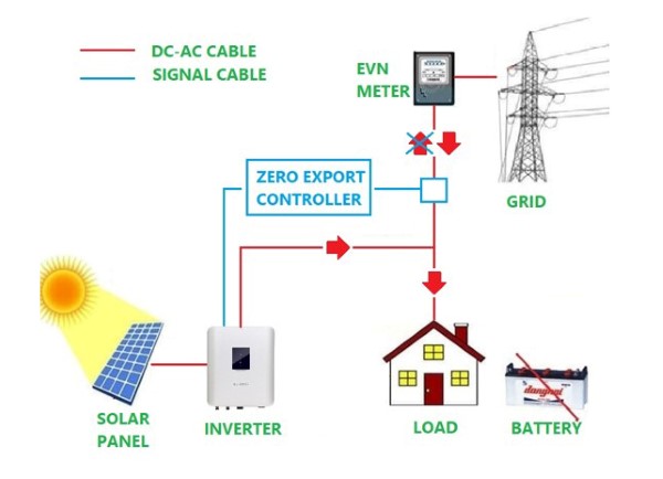 Thiết bị Zero Export Controller (ZEC) có chức năng giám sát dòng điện giữa lưới điện và hệ thống điện mặt trời (bao gồm tải tiêu thụ và inverter). Khi ZEC phát hiện dòng điện dư thừa từ hệ thống điện mặt trời có nguy cơ đẩy lên lưới điện, nó sẽ ngay lập tức gửi tín hiệu điều khiển đến inverter hòa lưới để điều chỉnh giảm công suất phát điện.